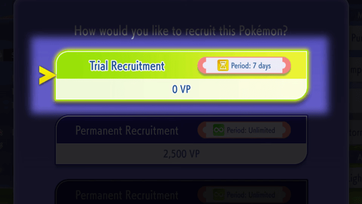- Xác nhận thuê (Recruit): Bạn có 1 lượt chọn miễn phí hoàn toàn mỗi ngày. Pokémon này sẽ ở lại trong Box của bạn trong vòng 7 ngày.